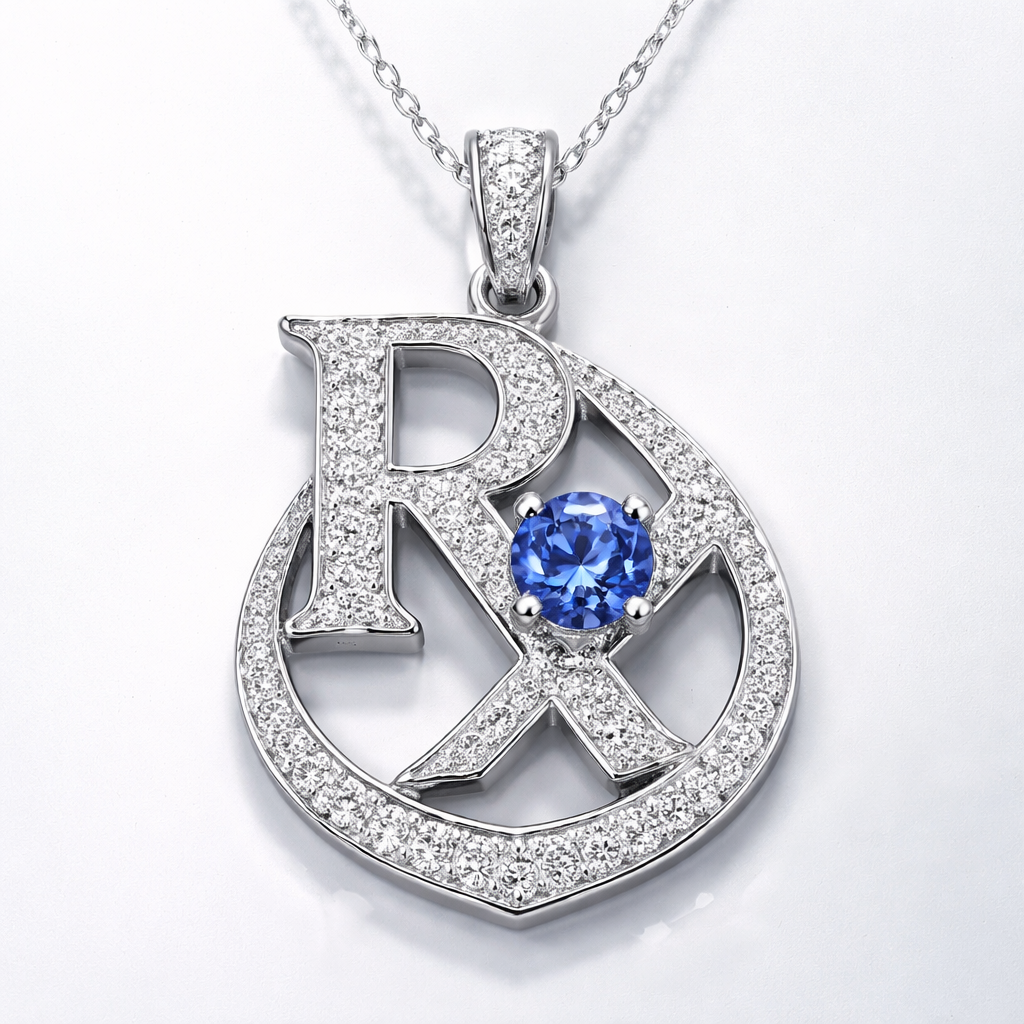 RX medical pendant with blue sapphire, and white diamonds