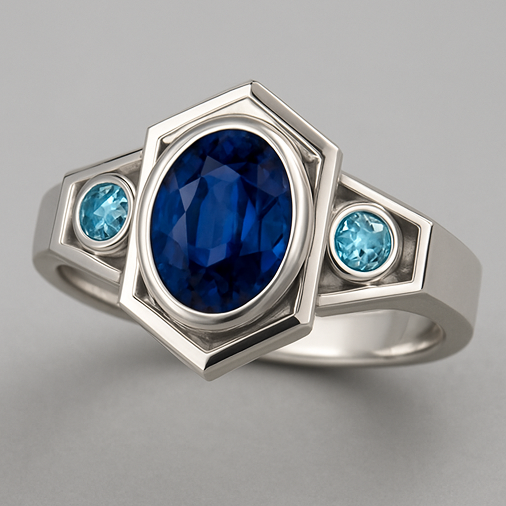Oval sapphire silver ring with round aqua topaz accent stones , geometric style