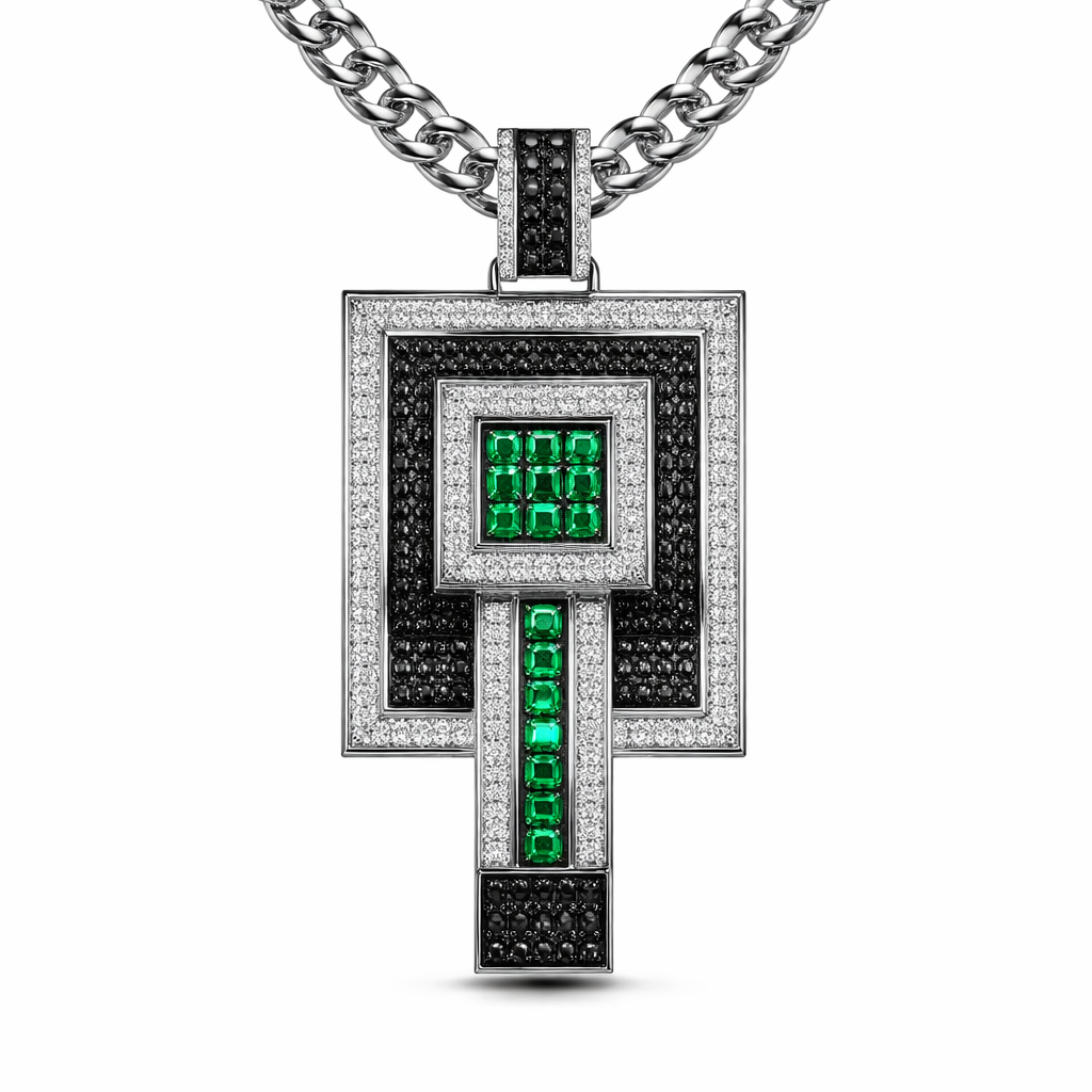 Geomatric pendant and chain for men of rectangular and sqaure shape of white and blcak diamonds and green of unique designs and special shape