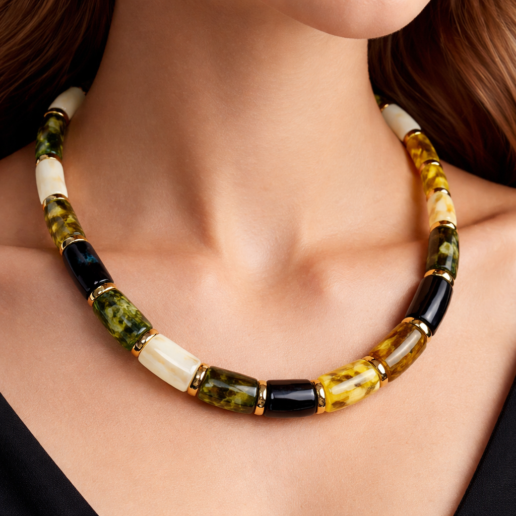 Only amber necklace for women simple but unique tube shape of stones white green black yellow colour mixing for young women , luxury style