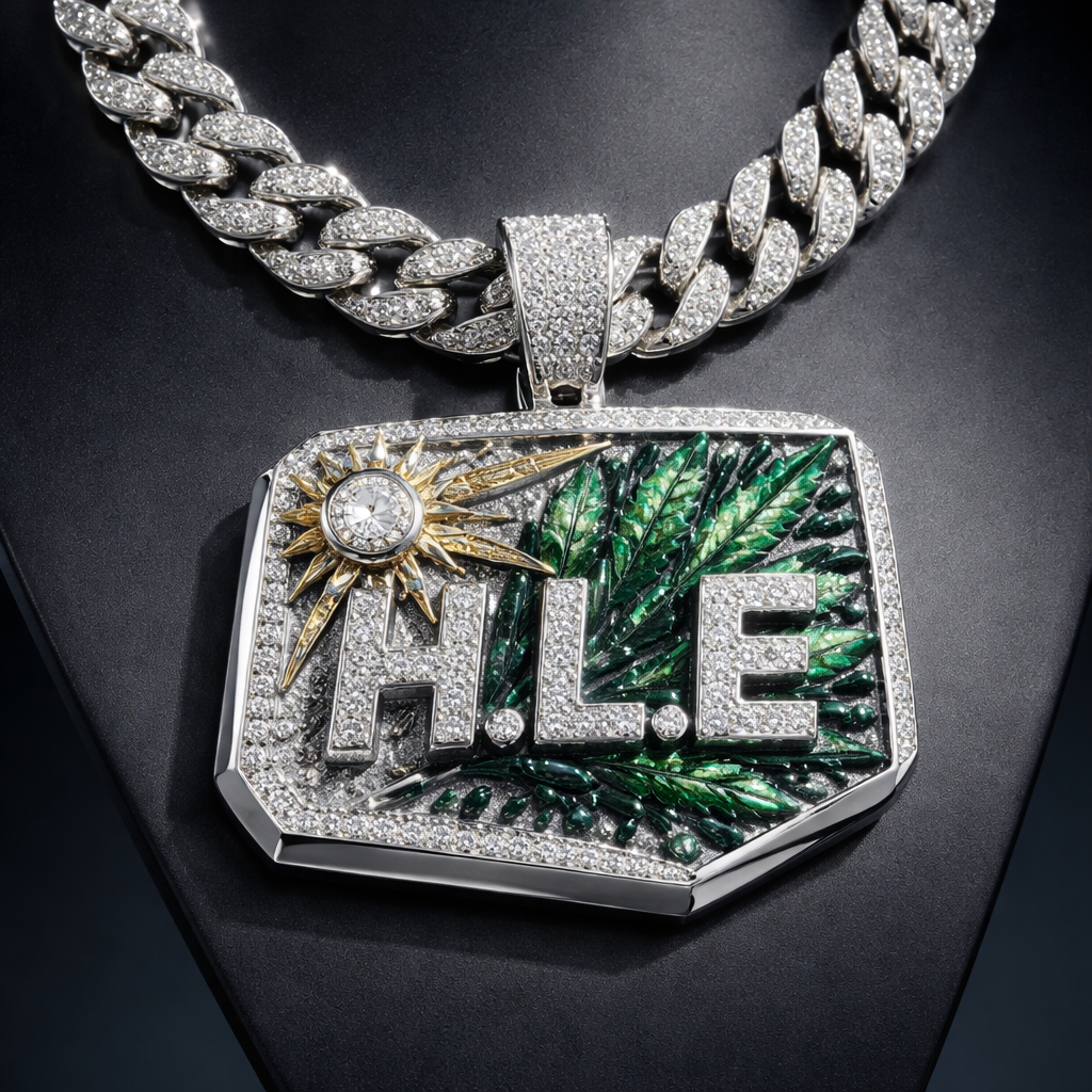 A modern men's necklace made of silver with diamond stones. H.L.E for the pendant unique design with a Cuban link with a sun and weed plant slanted to the right side plant in the back