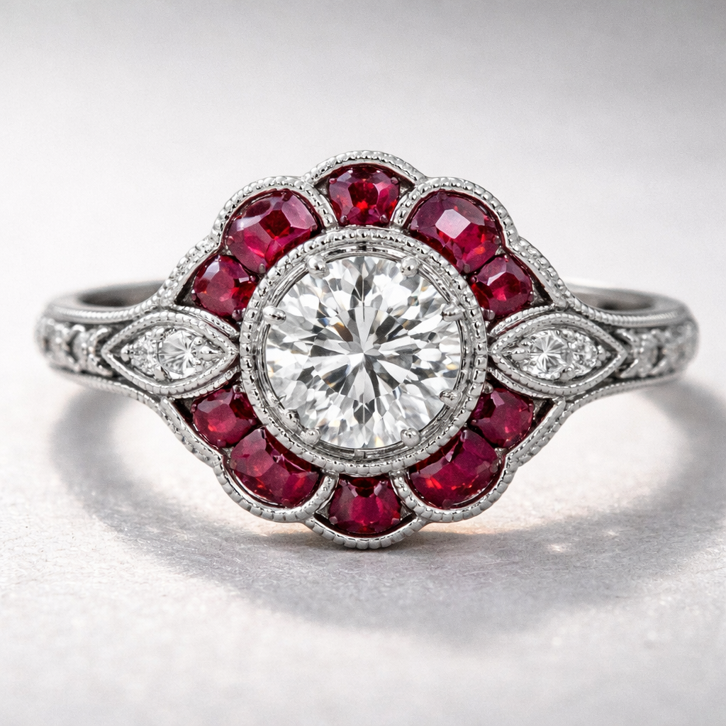 A vintage women's ring made of platinum with diamond and ruby stones suitable for engagement, vintage style