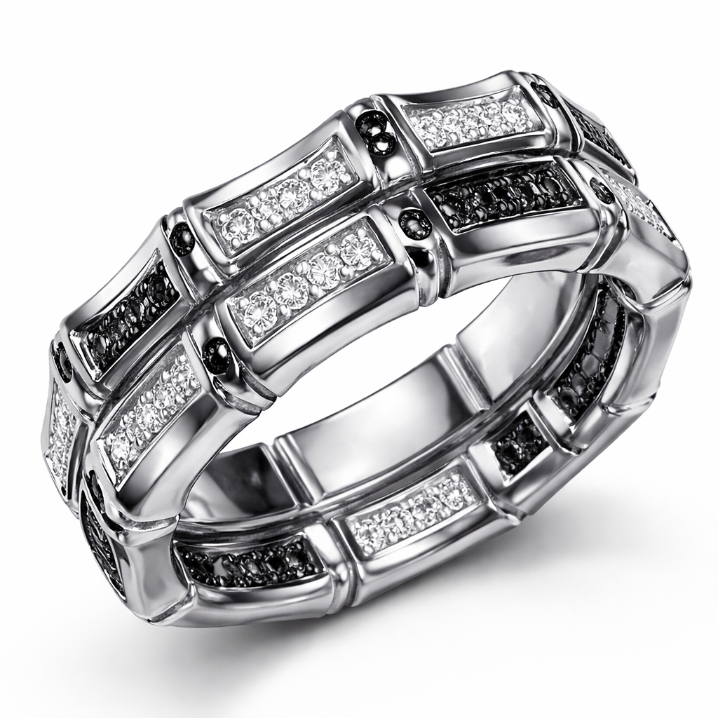 Ring Geomatric edge bold style for men with white and black diamonds The Bamboo ring translates the lightness and resilience associated with bamboo into a continuous, sculptural design. Crafted in 18k white gold, diamonds are placed with intention throughout the piece, enhancing its graphic character and refined sense of precision.