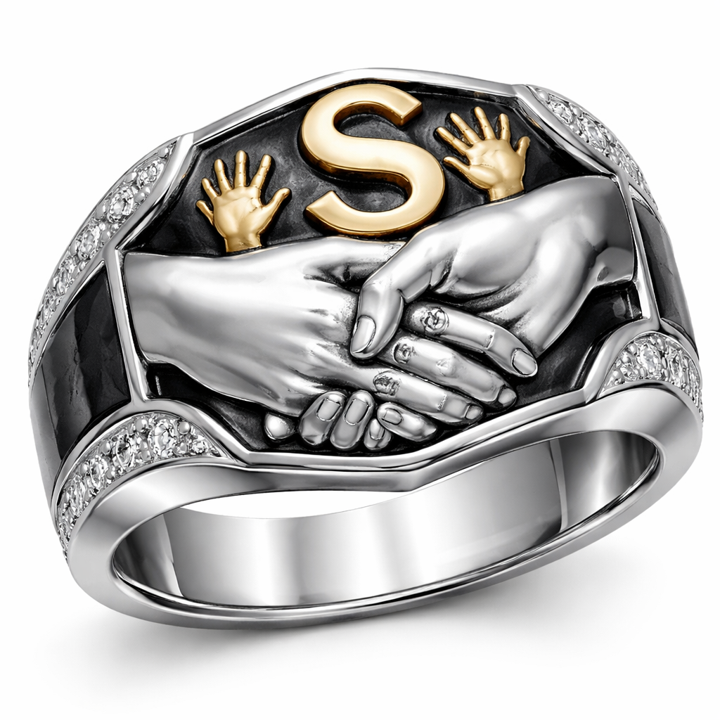 A women's ring. Anillo para hombre con una mano sujetando una mano de mujer y 2 manos pequeñas con una letra S atras, modern style