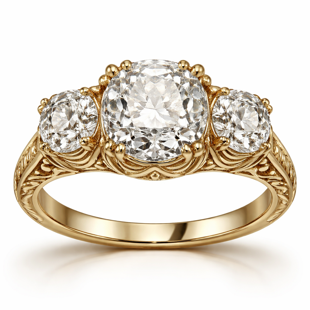 3 stone antique ring in 14k yellow gold featuring the following diamonds : Center: OLD MINE Length : 9.65 Width : 8.93 Depth : 6.18 Ratio : 1.08 Sides: old mine Length : 6.27 Width : 5.86 Depth : 4.28 The baskets are antique style v pattern with 8 prongs for the center diamond and 6 prongs on the side stones