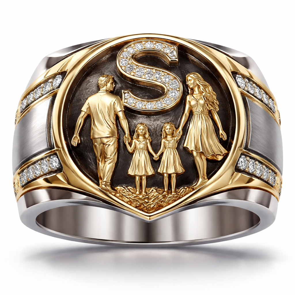A women's ring. Anillo para hombre con la mano de papa, mamá y 2 niñas pequeñas sujetandose de la mano y una letra S atras, modern style