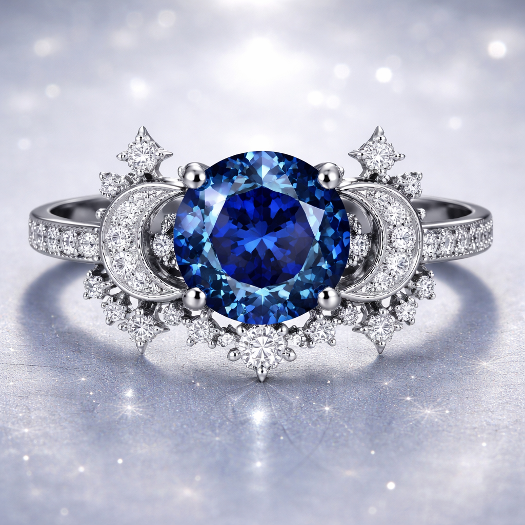 A luxury women's ring made of silver with sapphire stones. anel com pedra central redonda e duas luas do lado. pedras transparentes em cima e embaixo simulando estrelas, luxury style
