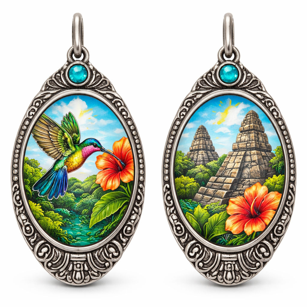 Oval charms del colibrí chupando miel en una flor Tikal Guatemala