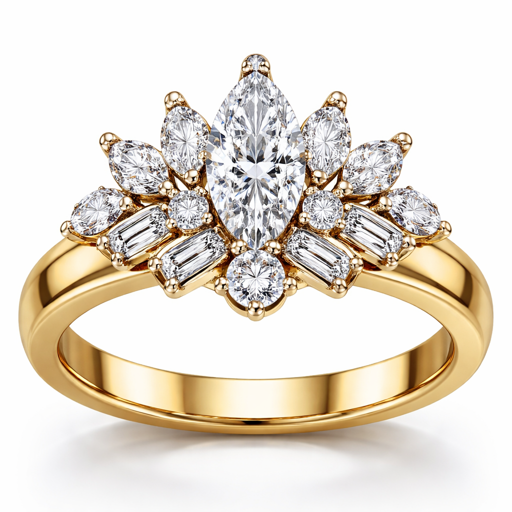 Ring AI Create a ring in 14k yellow gold, set in platinum. The center stone is a .60 size marquise diamond with a .25 round diamond set directly under the marquise. Add 6 more marquise shaped diamonds and 2 more round diamonds and 4 to 6 rectangle shaped baguettes in the shape of a crown with a 4mm thick gold yellow gold band, classic style