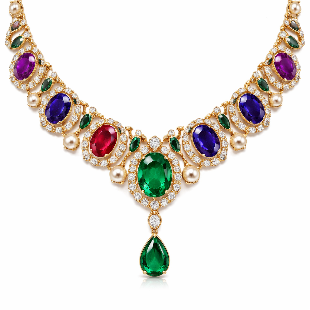 A classic women's necklace made of gold with ruby and sapphire and emerald and pearl and amethyst stones. don't change design. replace gems, classic style