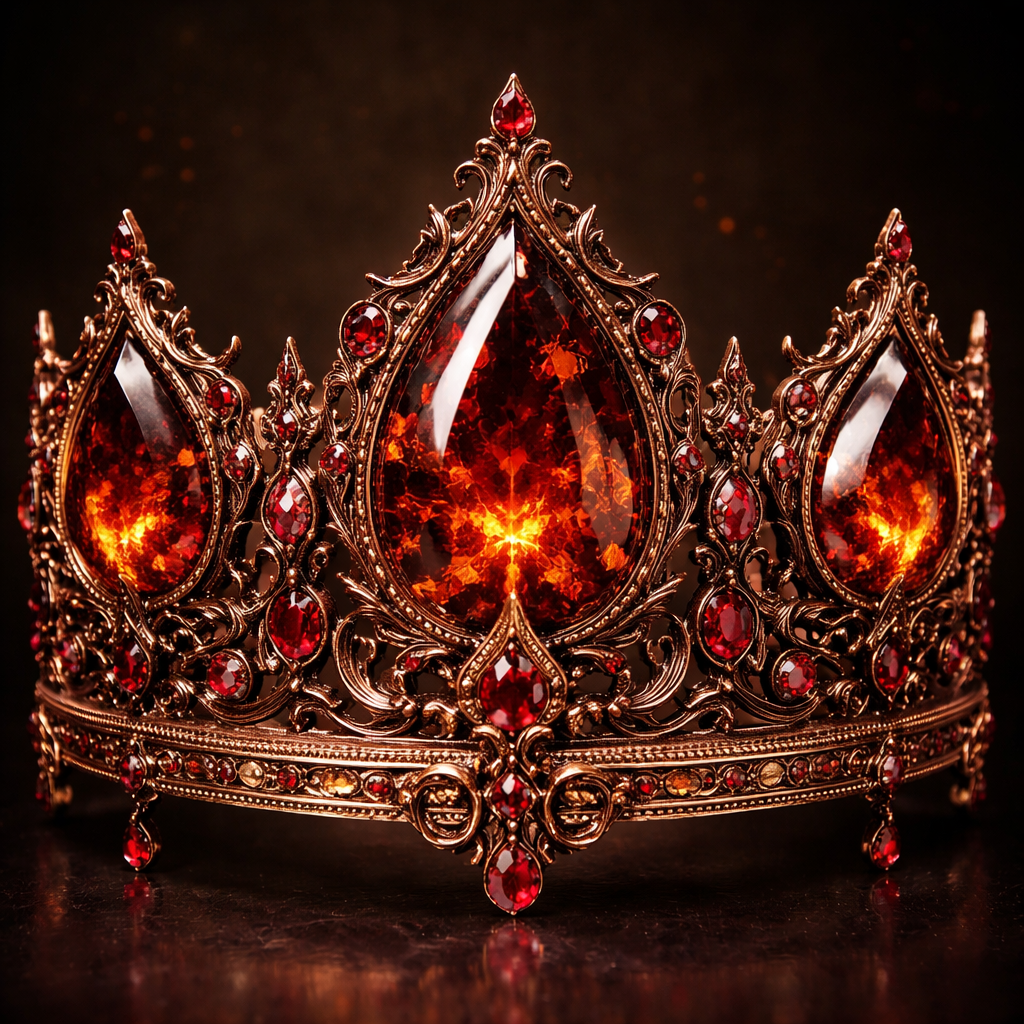 A giant thick golden crown with giant teardrop shaped painite gems and red diamonds. Also can the gold be dark rich rose gold?