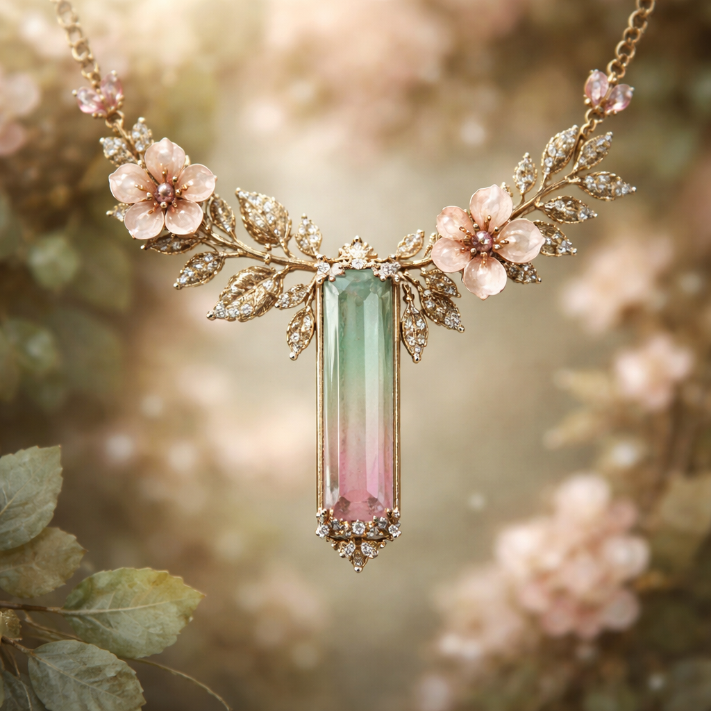 A beautiful soft coloured necklace with a skinny rectangular vintage green gem with a tiny tint of pink in it, nature_inspired style