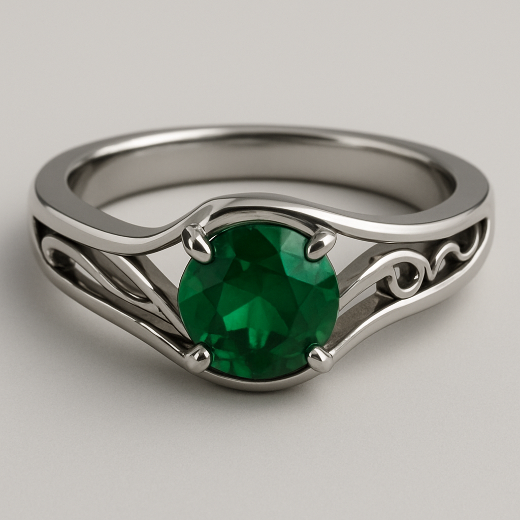 Create a design for a ring. Green stone in the middle with crafted on the side , modern style
