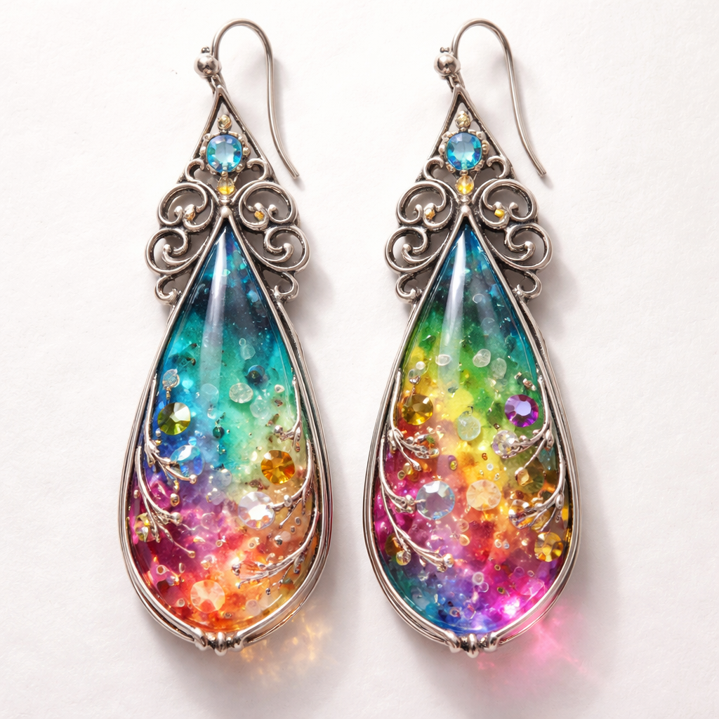 Colourful resin drop earrings in silver with embedded stones or beads, art_nouveau style