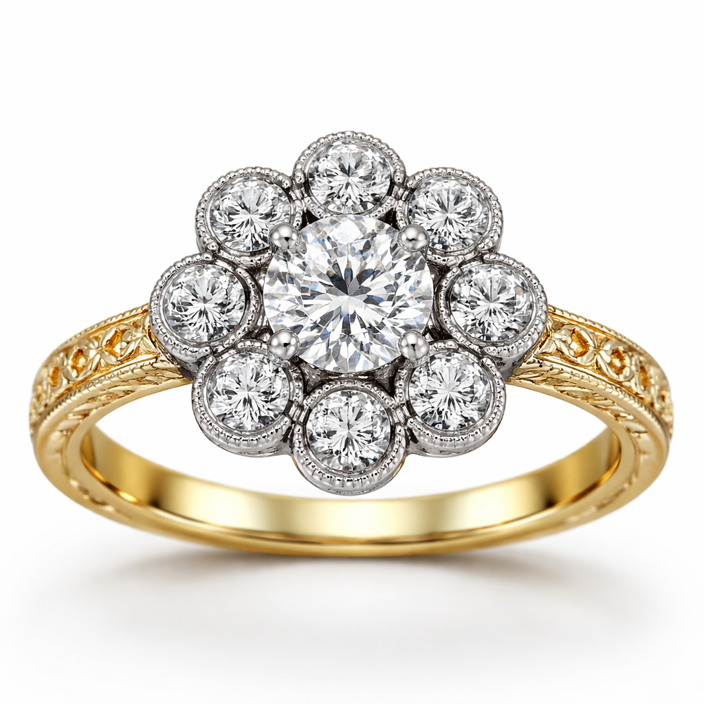 Create a flower style ring with a three-quarter carat center stone and eight round stones set around the center stone in a flower style halo set the diamonds in platinum and use a 14 karat gold yellow shank, vintage style