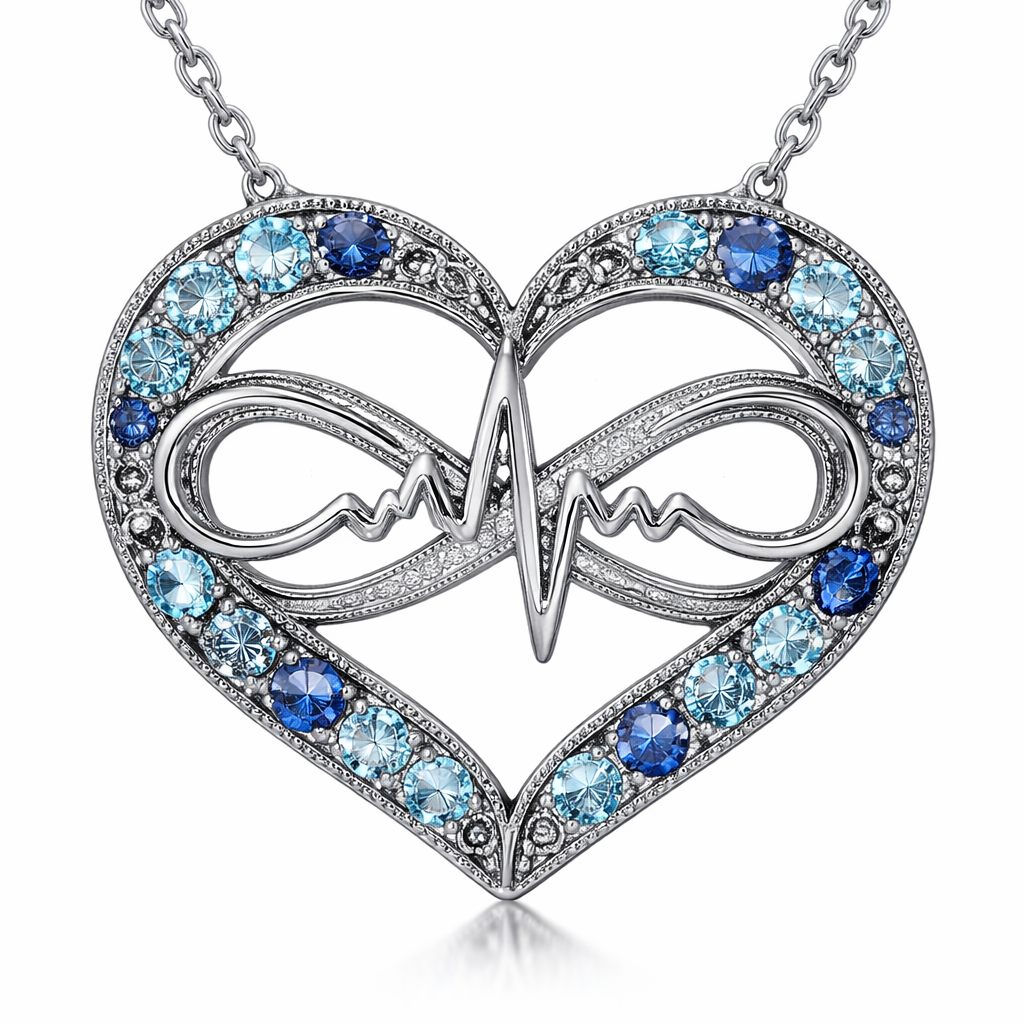 A heart necklace with the infinity symbol and heartbeat wave with alternating March, September and December birthstones all the way around the heart and infinity symbol