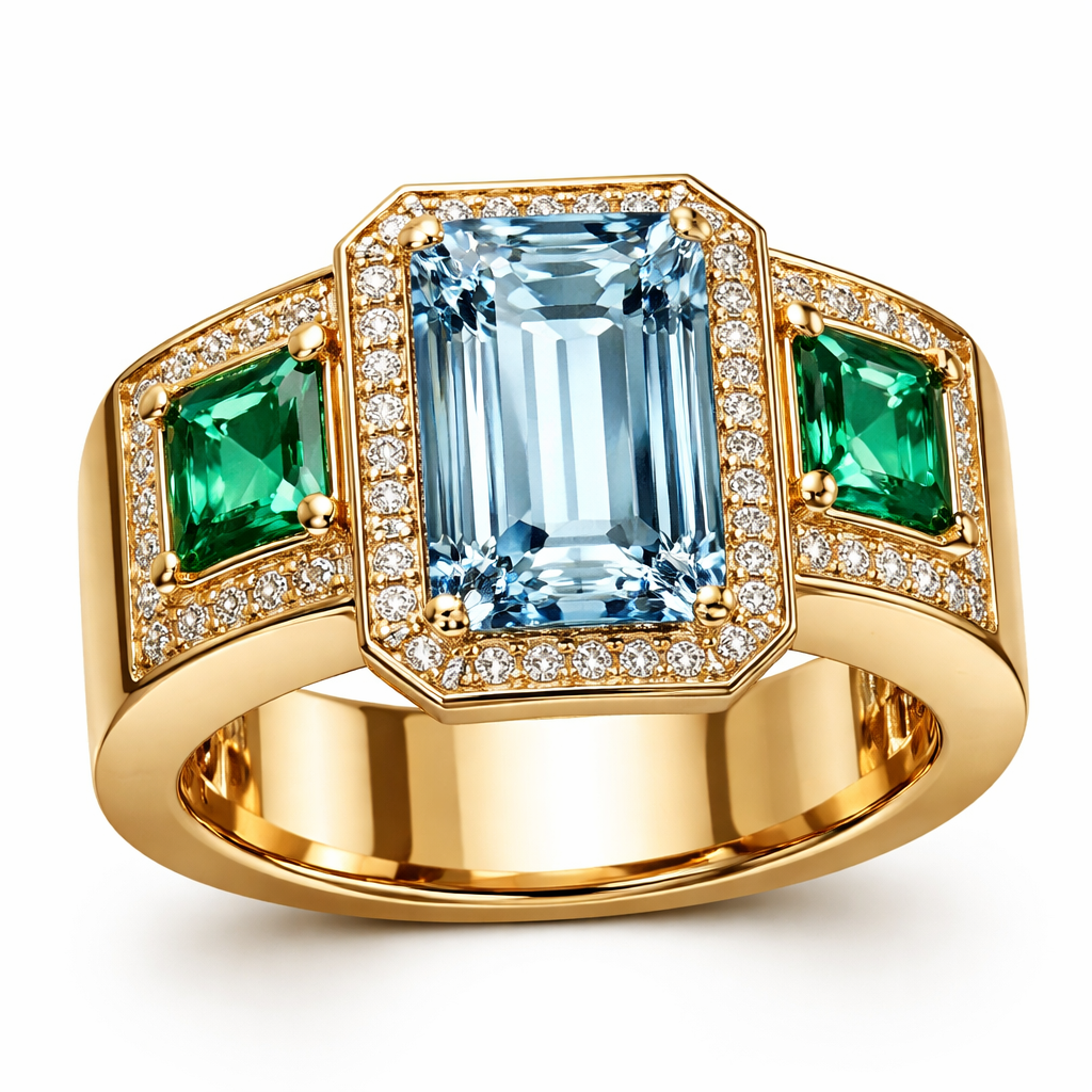 Wide yellow gold band with Vertical emerald cut aquamarine center stone and a square cut emerald on either side, luxury style