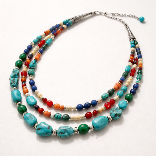Turquoise nuggets, red coral discs, spiny oyster chips, lapis beads, malachite beads and bone with silver findings multi...