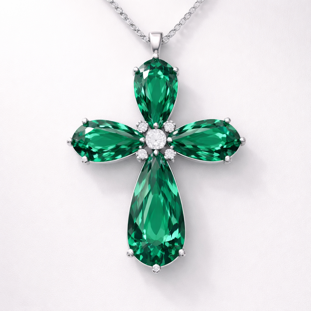 Pearl cut emerald cross, white gold, hidden bale, accent diamonds, simple, timeless, and elegant