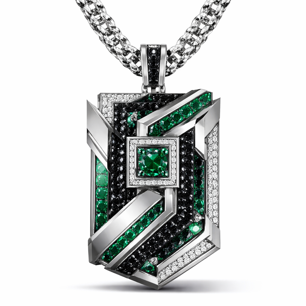 Geomatric egdy angles and edges pendant and chainfor men of rectangular and sqaure shape of white and blcak diamonds and green of unique design and special shape