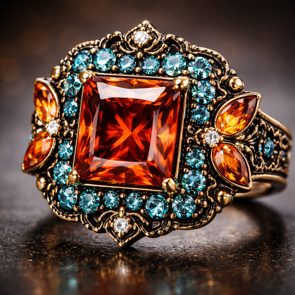 A ring with a square shaped deep rich orange gem with dark baby blue diamonds surrounding it with orange butterfly shaped gem and dark gold architecture