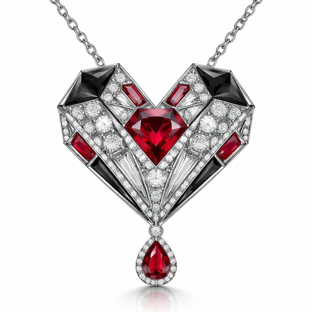 Geomatric love for valantine eve of architecture shape and edges of white and black diamonds and ruby of white background with chain