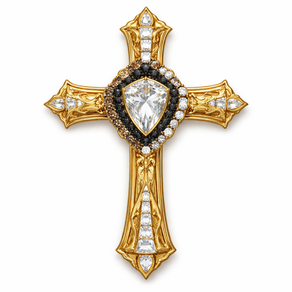 Create an elongated cross, in the center of the cross is a shield cut diamond. Surrounding the shield cut diamond is a ring of diamonds burnish set into gold, have the ring of diamonds fade from black diamonds to grey diamonds to white. On the arms of the cross put intricate Hand engraving. On the top and bottom arms of the cross, have custom cut brilliant trapezoid diamonds that go from small to large. Make this in yellow gold , baroque style