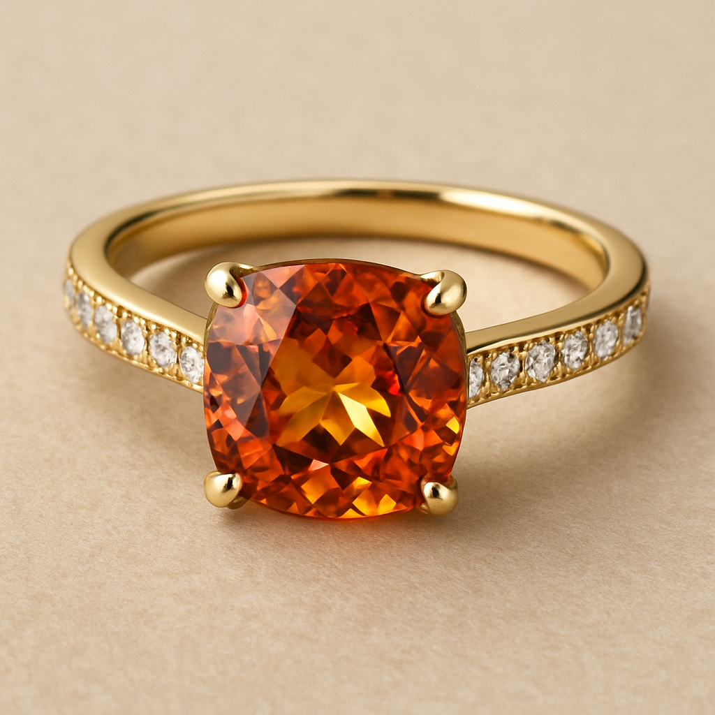 Diamond ring with a smooth heart-shaped stone. The ring is round and features small diamonds.