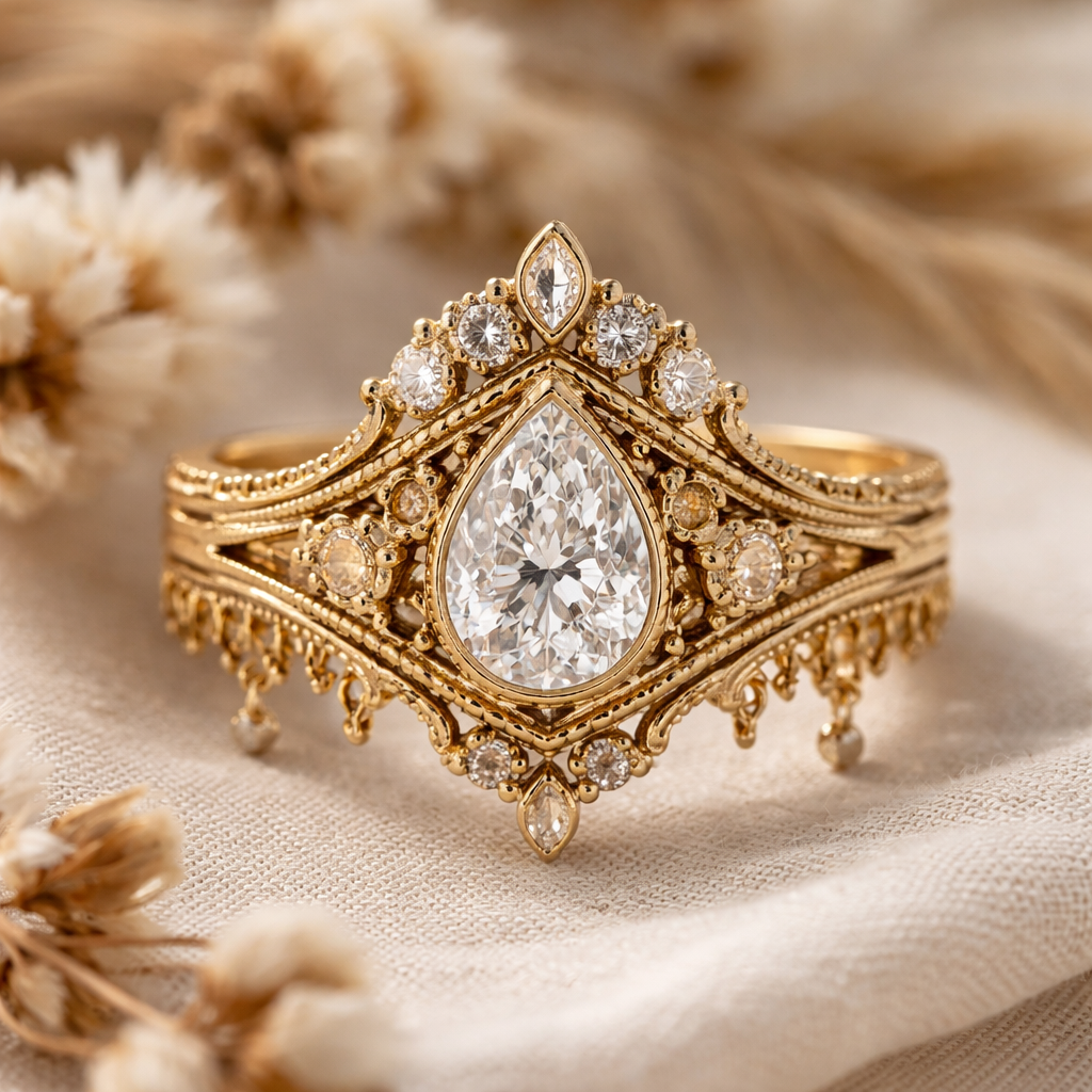 Yellow gold engagement ring with pear shaped diamond and either a design or diamonds on the band