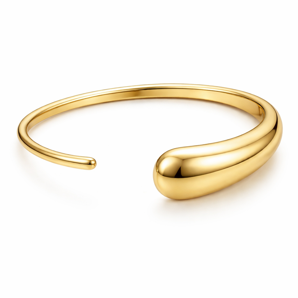 Gold bangle, thinner getting thicker towards the top of the hand, open on the top, gap between is 2.5 cm and on each sid...
