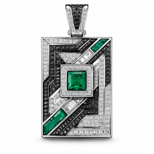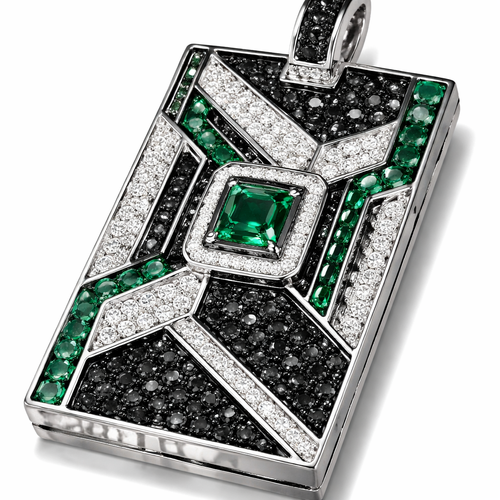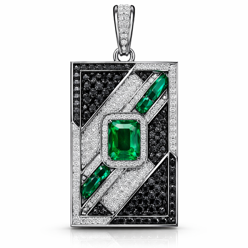 Geomatric pendant for men of rectangular shape of white and black diamonds and emrold of unique designs and shapes