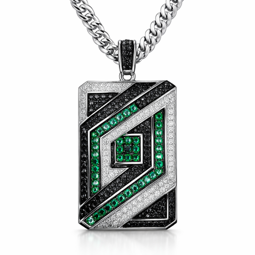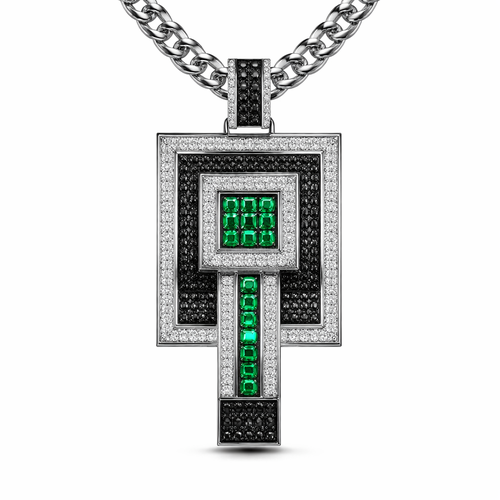 Geomatric pendant and chain for men of rectangular and sqaure shape of white and blcak diamonds and green of unique desi...