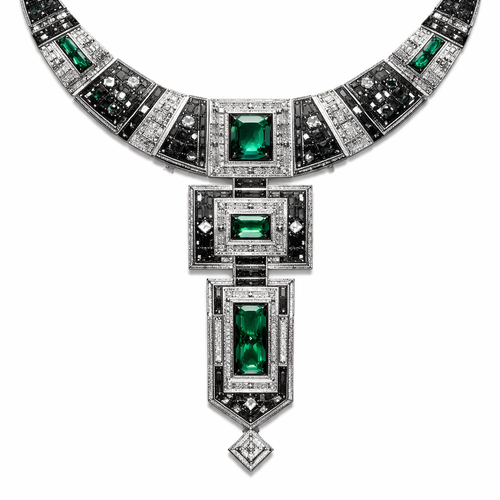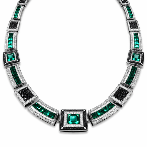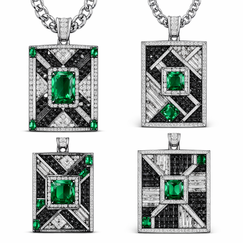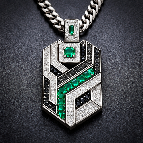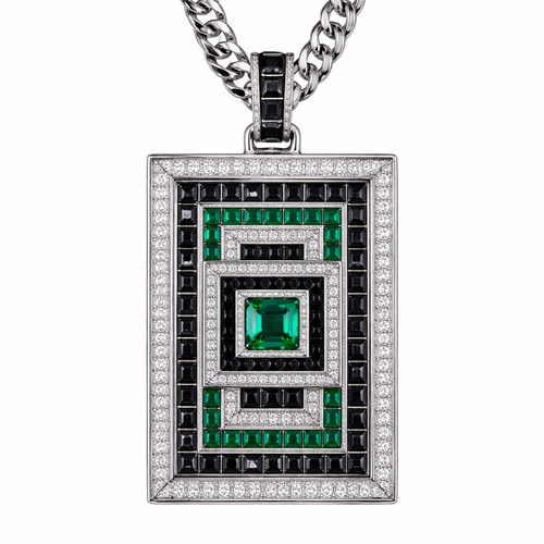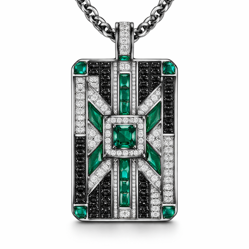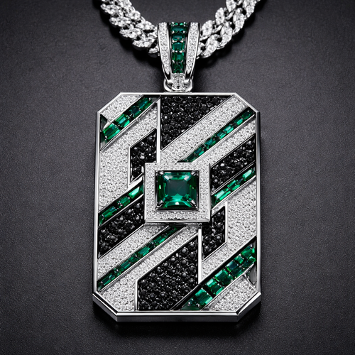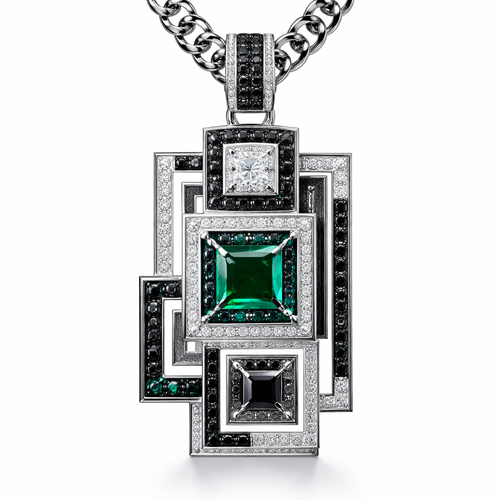 Geomatric necklace for men of rectangular and sqaure shape of white and blcak diamonds and green of unique designs and s...
