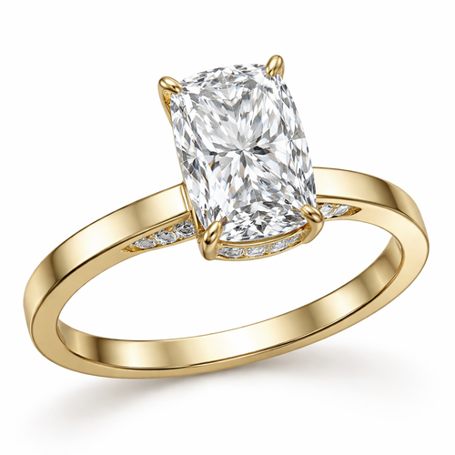 Engagement ring. 3mm straight flat band. 14k gold. Solitaire, low basket setting. 2 ct elongated cushion center stone. H...