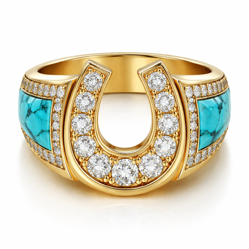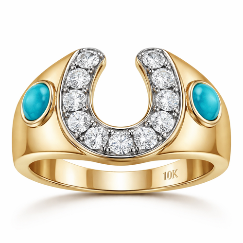 10k gold horseshoe men’s ring with 1.0 lab created diamonds 13 total with real turquoise side stones