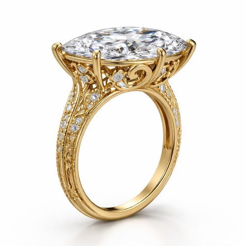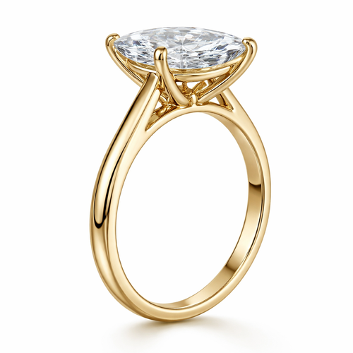4 carat solitaire marquis cut, yellow gold, high setting, show a side view
