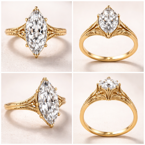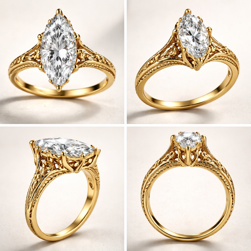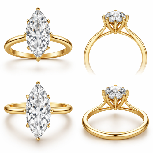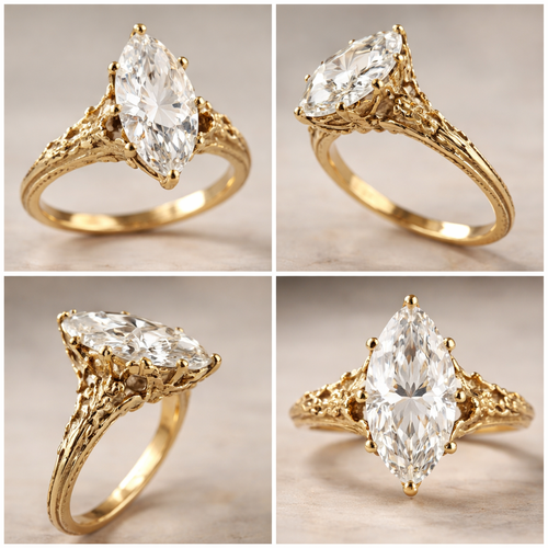 4 carat marquise solitaire ring, high setting, with 6 prongs, yellow gold, and create a view from different angles