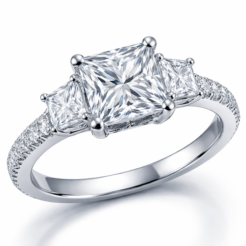 An engagement ring with a huge square cut diamond in the middle and to smaller on the sides. The band is also covered in...