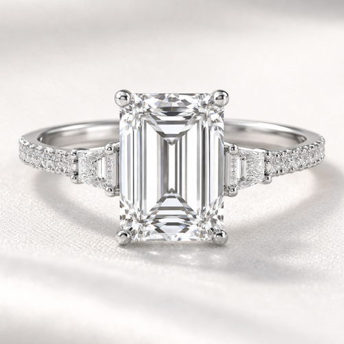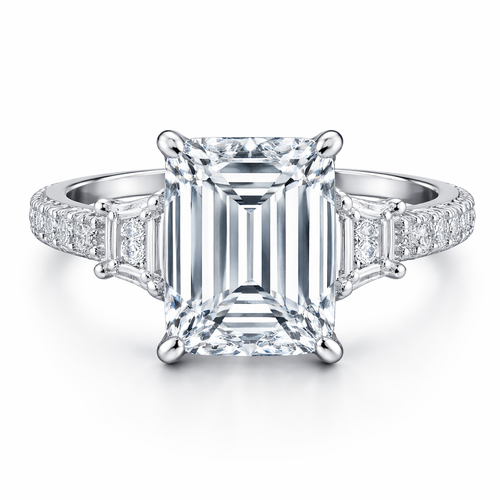 emerald cut engagement ring, 3.5 carats with pave band and trapezoid side diamonds