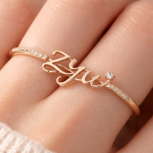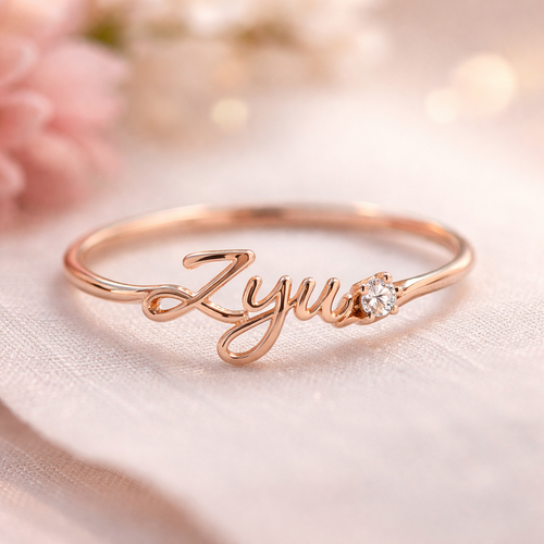 A ring with a tiny casual diamond and the word “ZYU” on it. The word “ZYU” make it artistic and blend into the design I ...