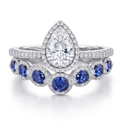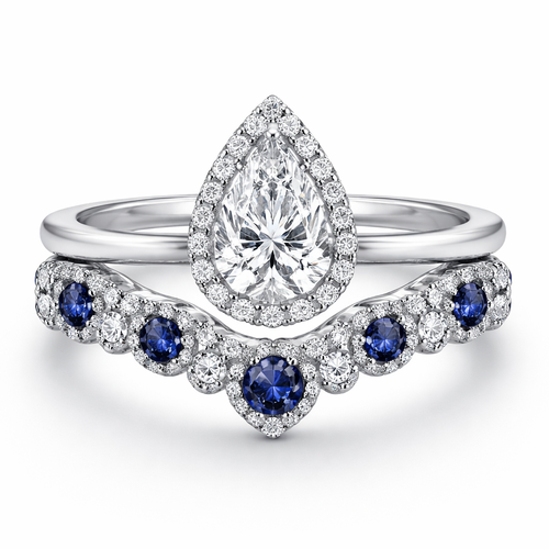 White 14k gold band with a pear shape diamond. A sapphire jacket wedding band