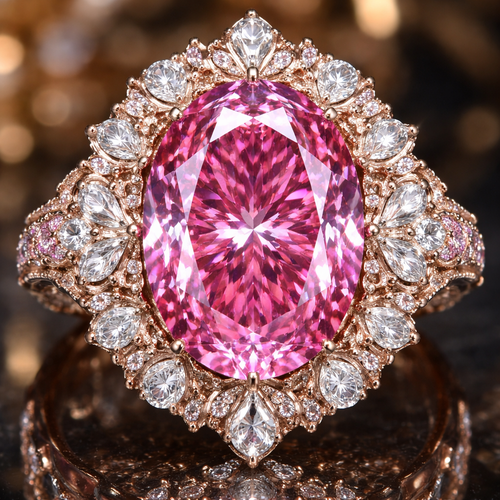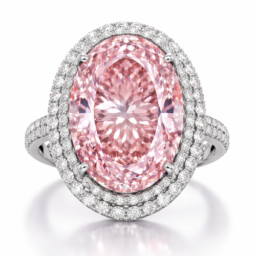 A ring with a giant 50 carat elegant vivid pink diamond with a halo design around it