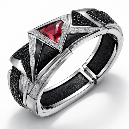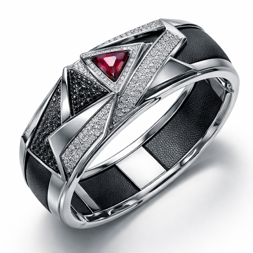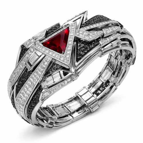 Geomatric shape and architecture shape and voulme of edgy style of bracelet with diamonds and black diamonds and rubybof...