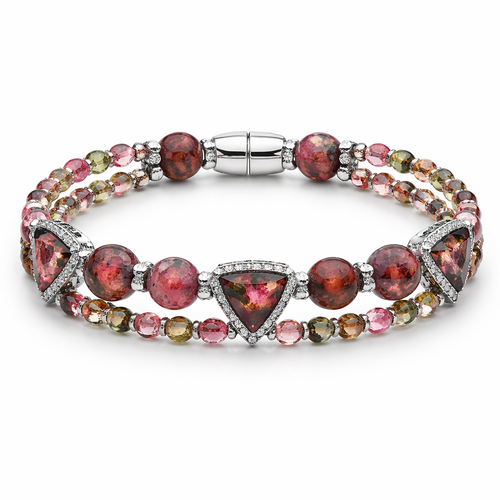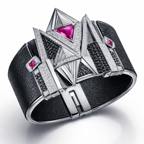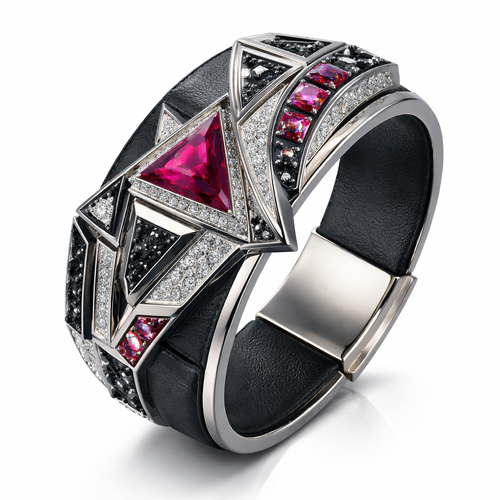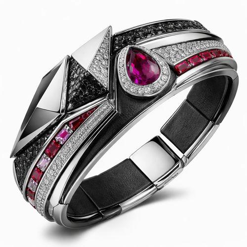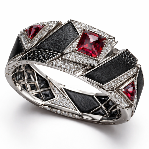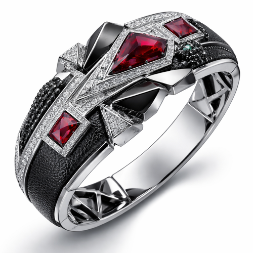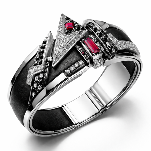 Geomatric shape and architecture shape and voulme of edgy style of bracelet with diamonds and black and rubybof white ba...