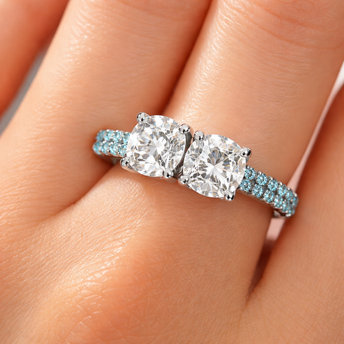 Ring with 2 cushion cut diamonds and an aquamarine band, show on a finger