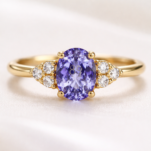 A luxury vintage-style ring features a 0.89-carat oval Tanzanite as the center stone. The band is crafted in 18K yellow ...