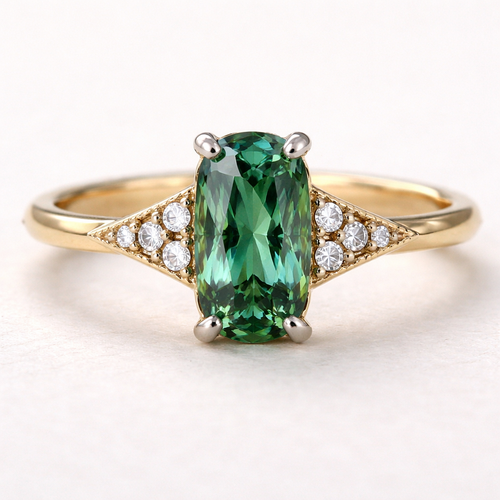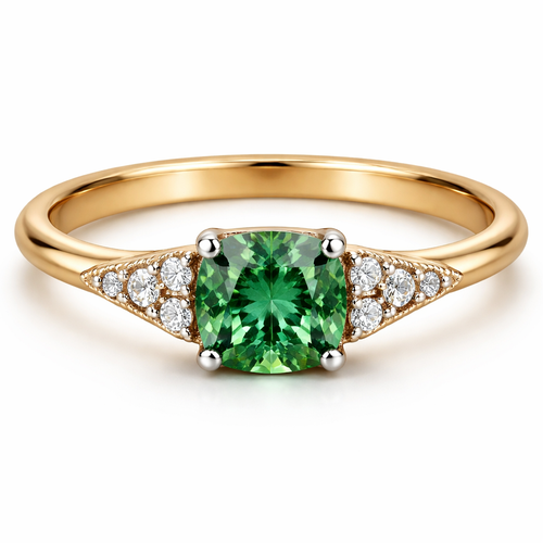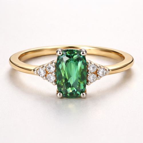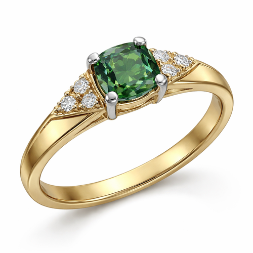 A yellow gold 18 carat thin band with a sharp angled edge ring. Central green sapphire in a cushion cut. Either side of ...