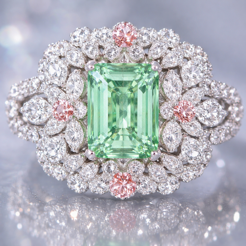 A ring with a rectangle shaped light green gem with tons of sparkles. Lots of smaller flower shaped gems surround it wit...