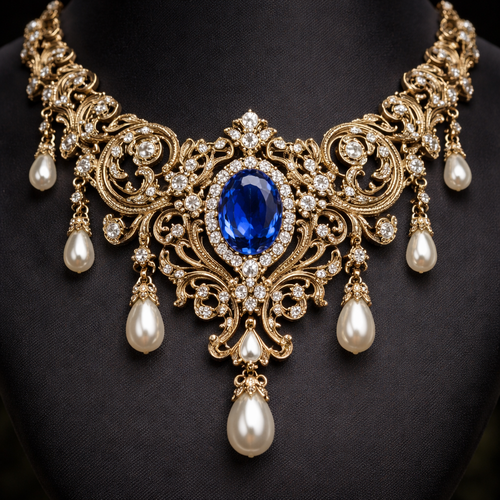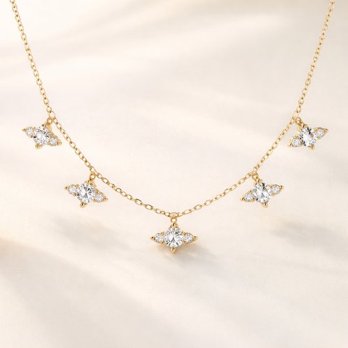 A chain with 5 pendants scattered , each pendant will have a solitaire in the centre and a marquis on each side of the s...