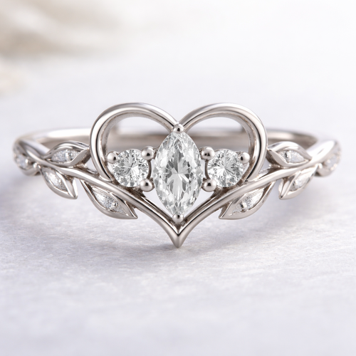 Marquise with a thin twist leaf vine heart shaped three stone engagement ring